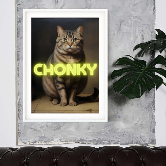 Chonky neon art cat portrait, altered art antique oil painting print