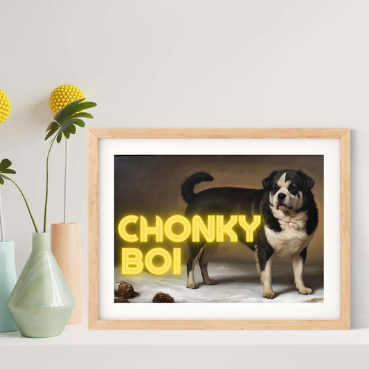Chonky Boi neon art, altered art antique oil painting dog art print