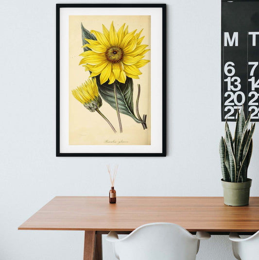 Sunflower print, Yellow Flower Art Vintage Botanical Print