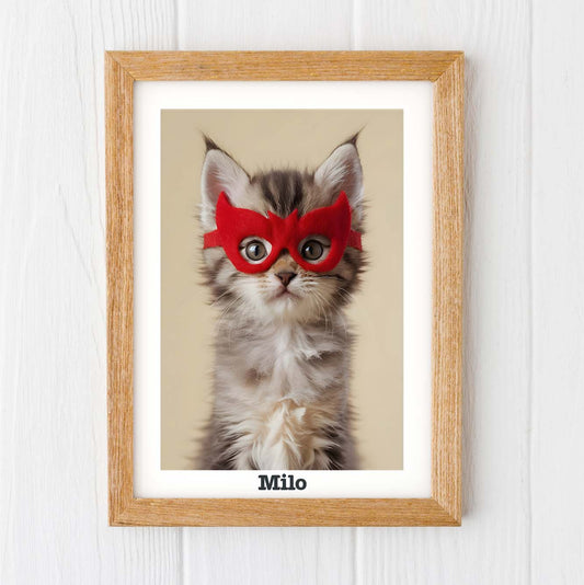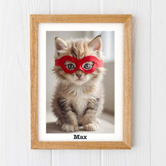 Children's Superhero Tiny Cat portrait, Fluffy Kitten print superhero gift