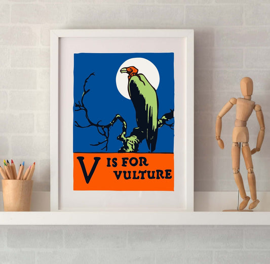 V is for Vulture print, letter V print, Animal alphabet bird wall art abc print