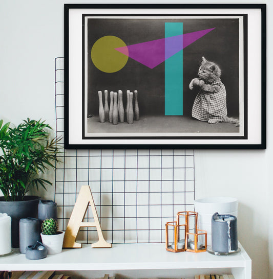 Framed Altered vintage Photography cat Print, altered digital art surreal baby kitten bowling graphical art print