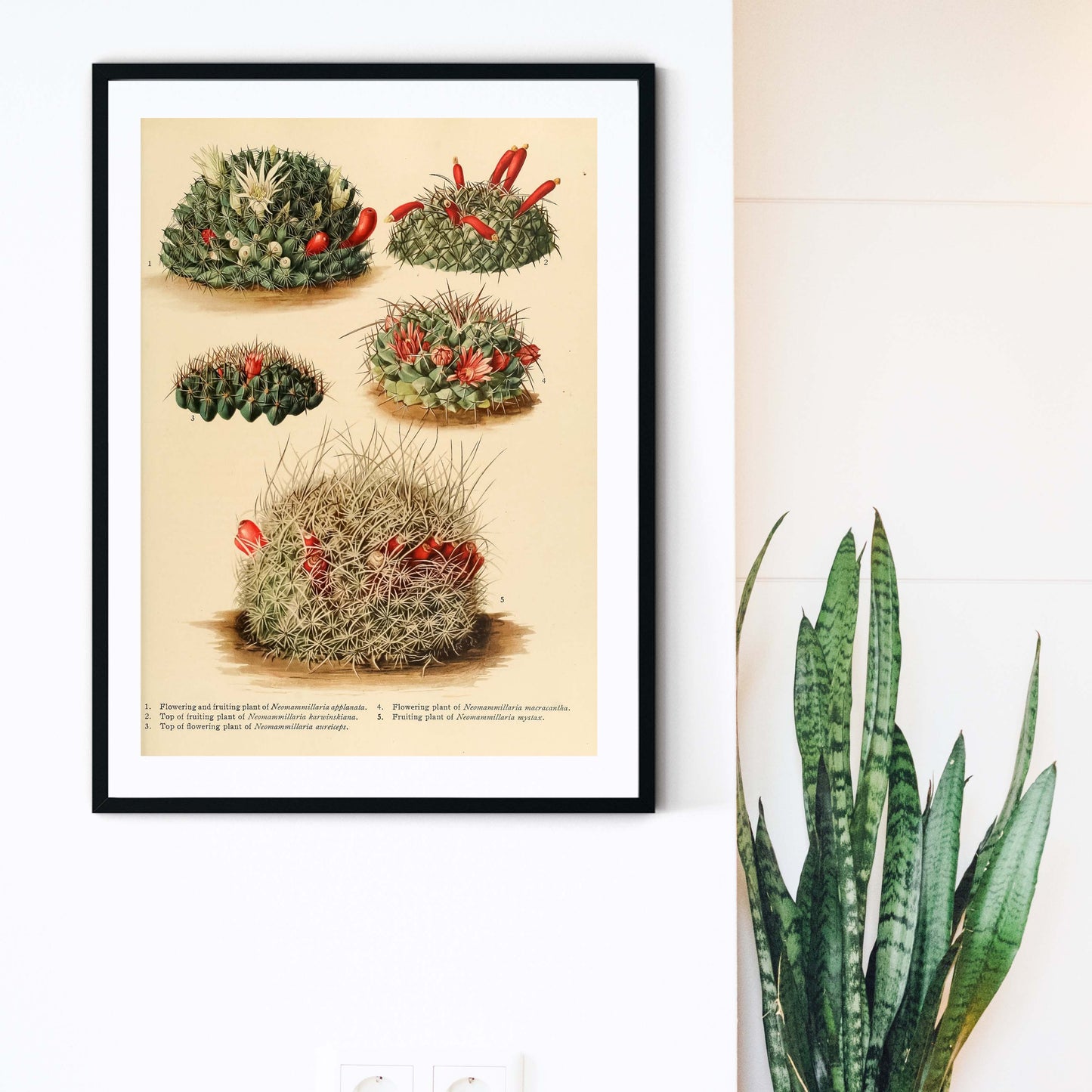 Vintage Cactus print, cactus flower print. Botanical naturalist illustration art print 'The Cactaceae' of 8 cacti, taken from the original 1919 coloured scientific drawings