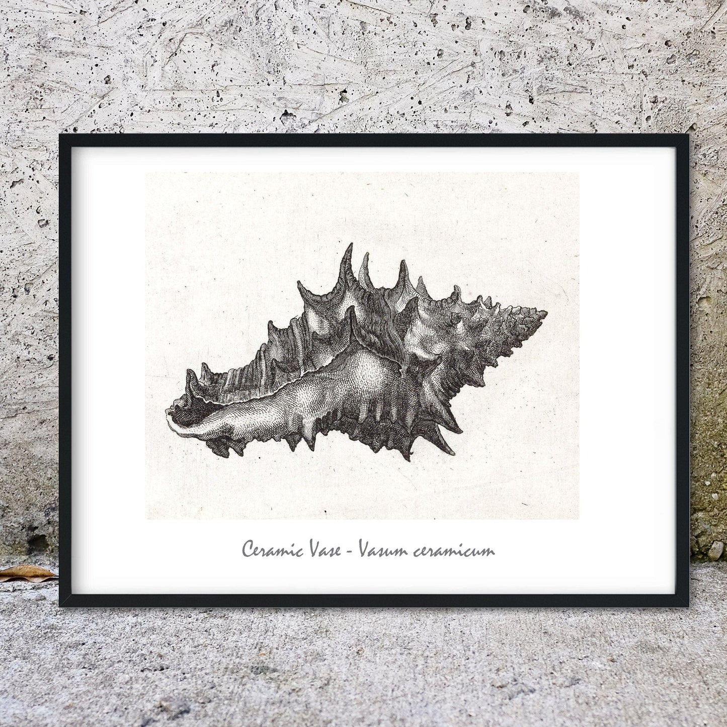 Vintage shell drawing art print taken from the Original 1645 (Stuart period) line drawing. Minimalist wall art print of a Ceramic Vase sea shells UK naturalist study