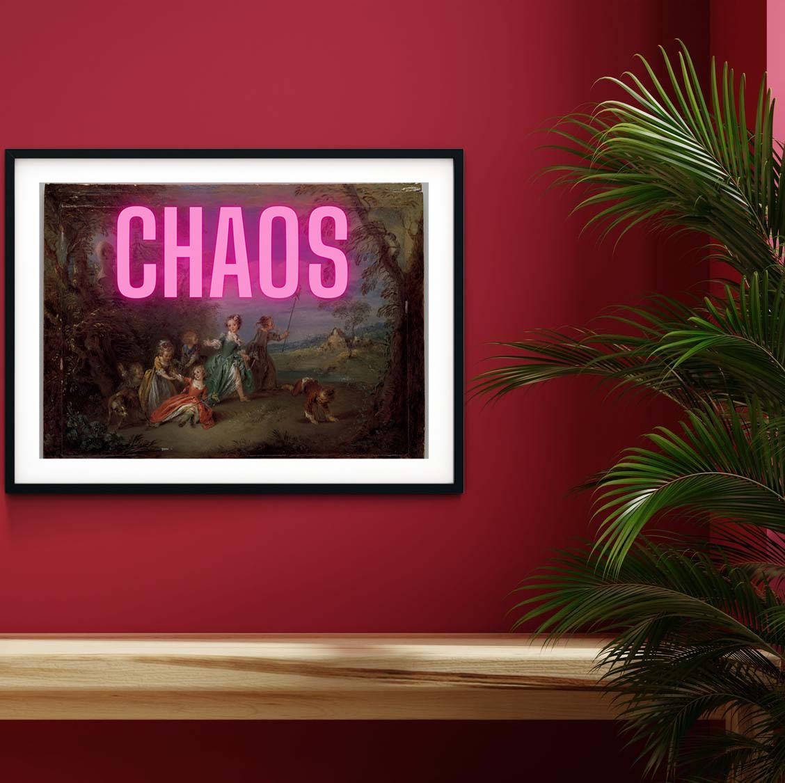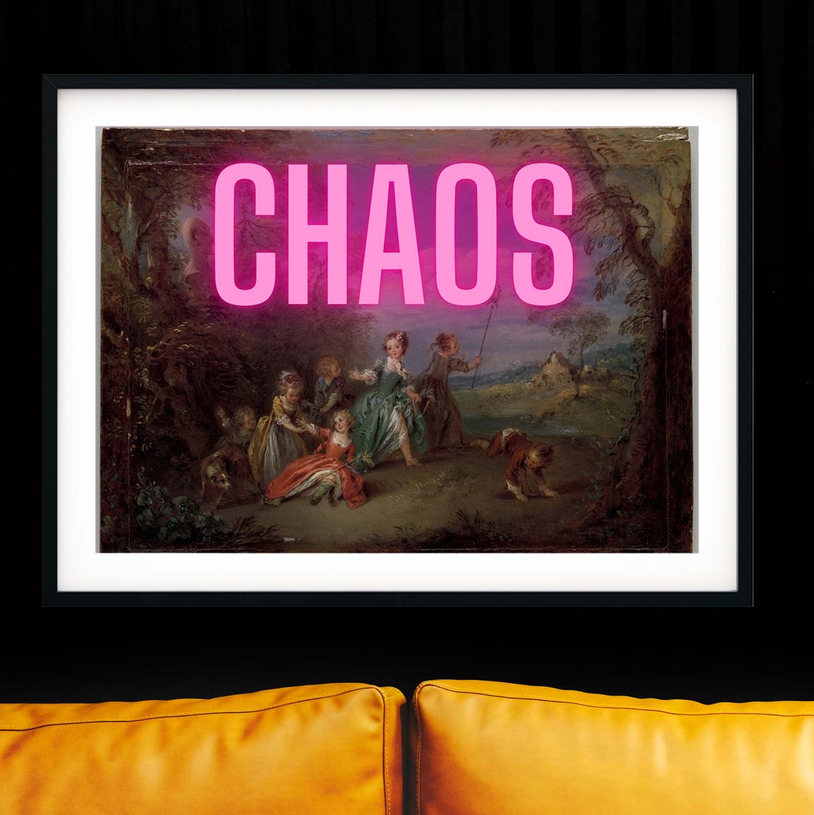 Modern purple neon art Chaos neon sign style typography over a vintage oil painting of a children and animals renaissance art tongue in cheek funky prints.