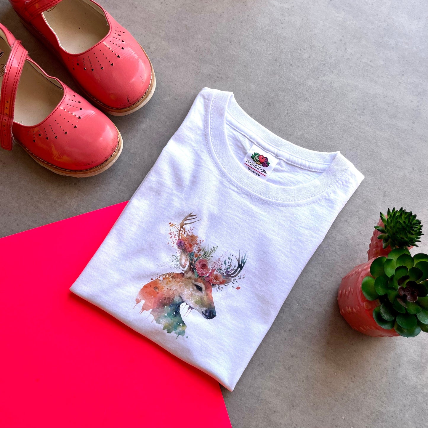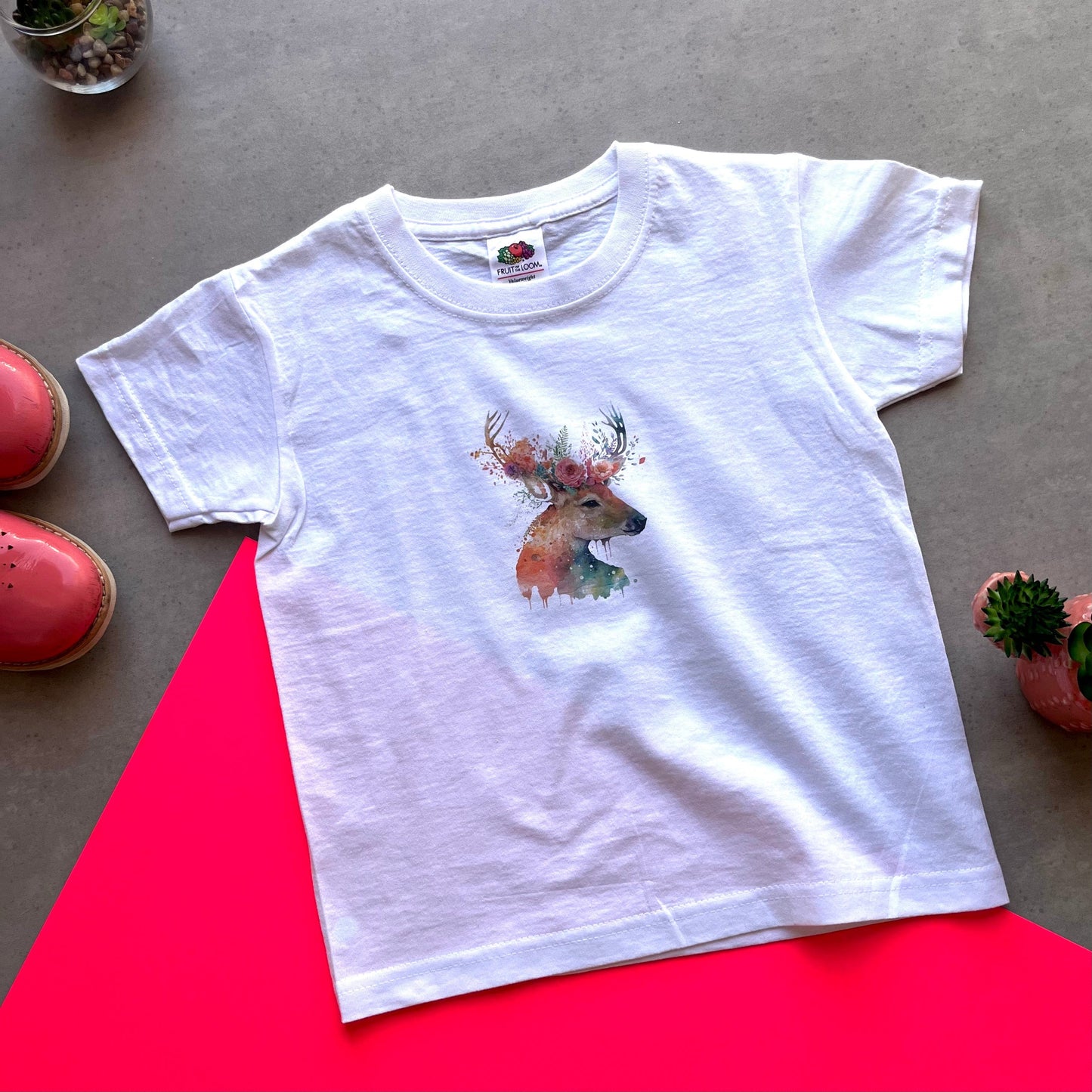 This cute kids floral stag t shirt has a watercolour illustration of a boho deer design