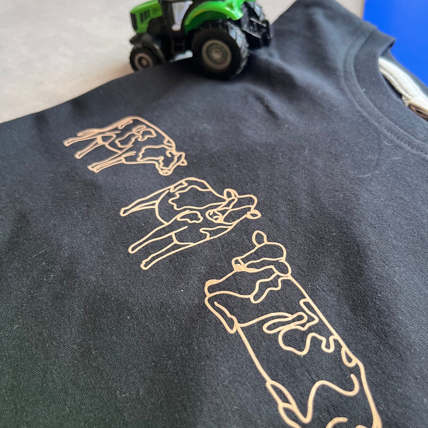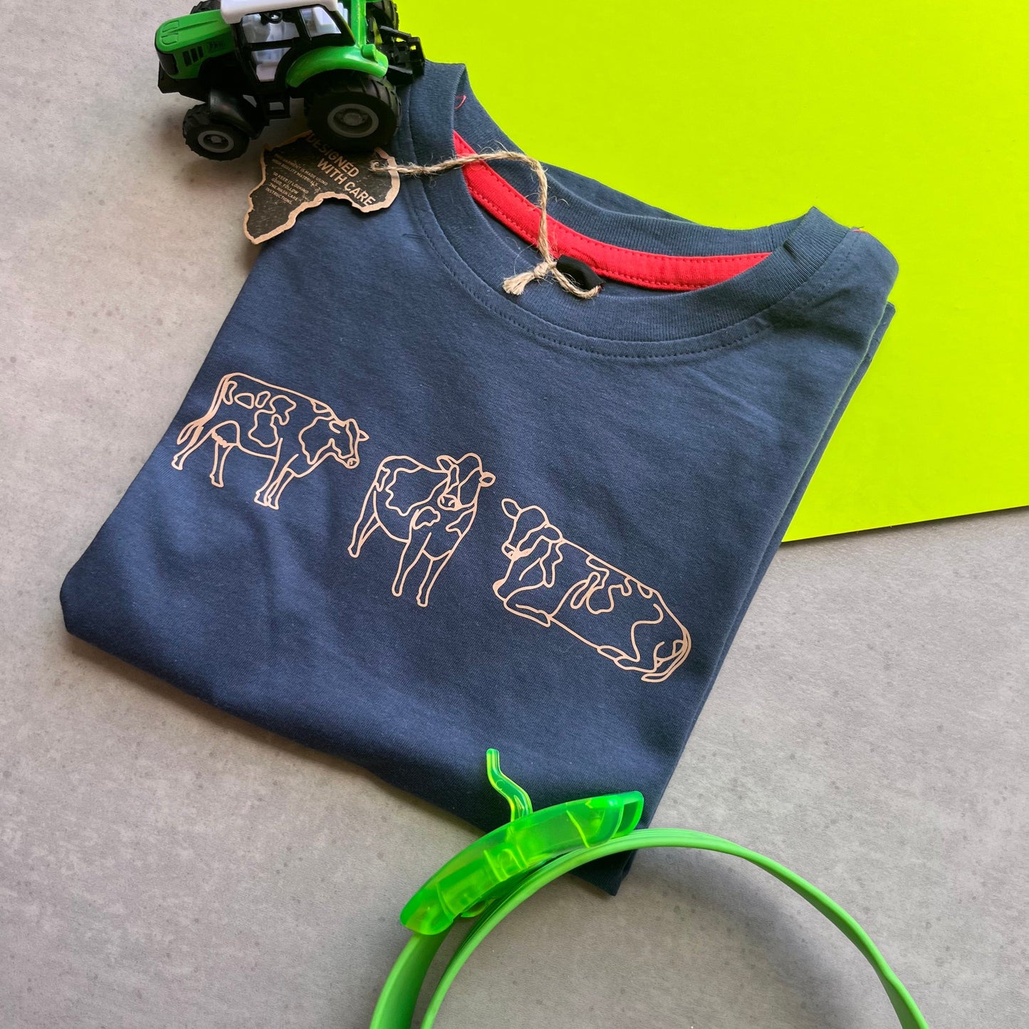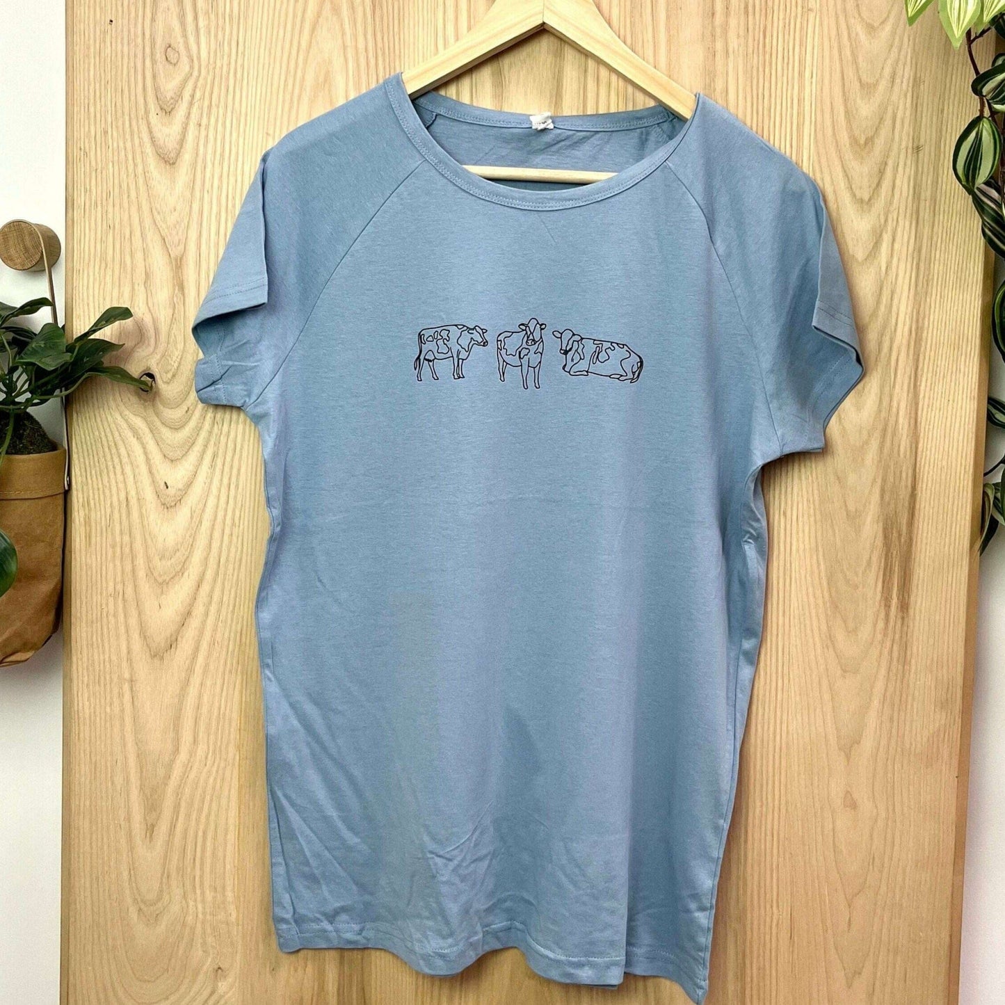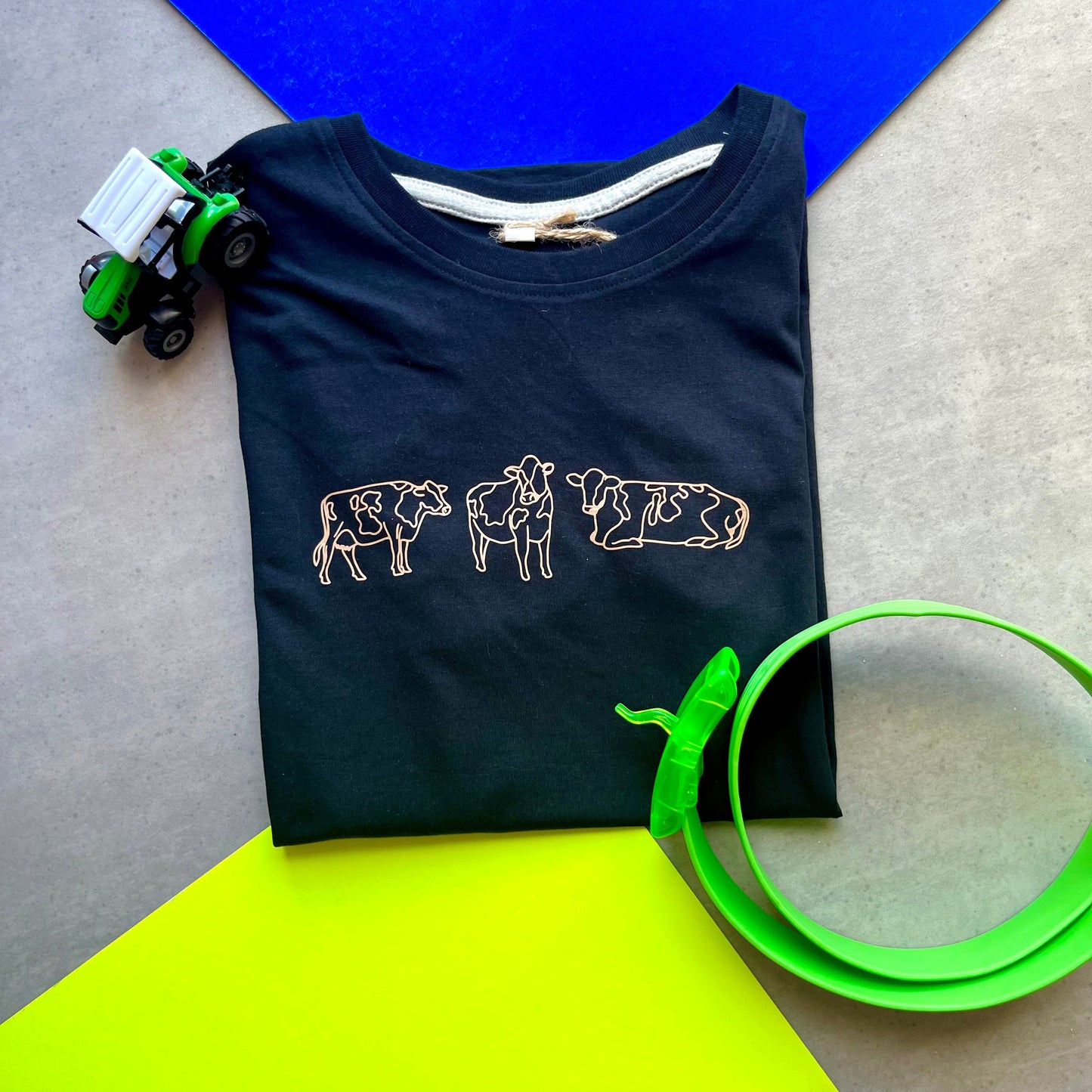 This minimalist cow t shirt features a line drawing of three cows across the front