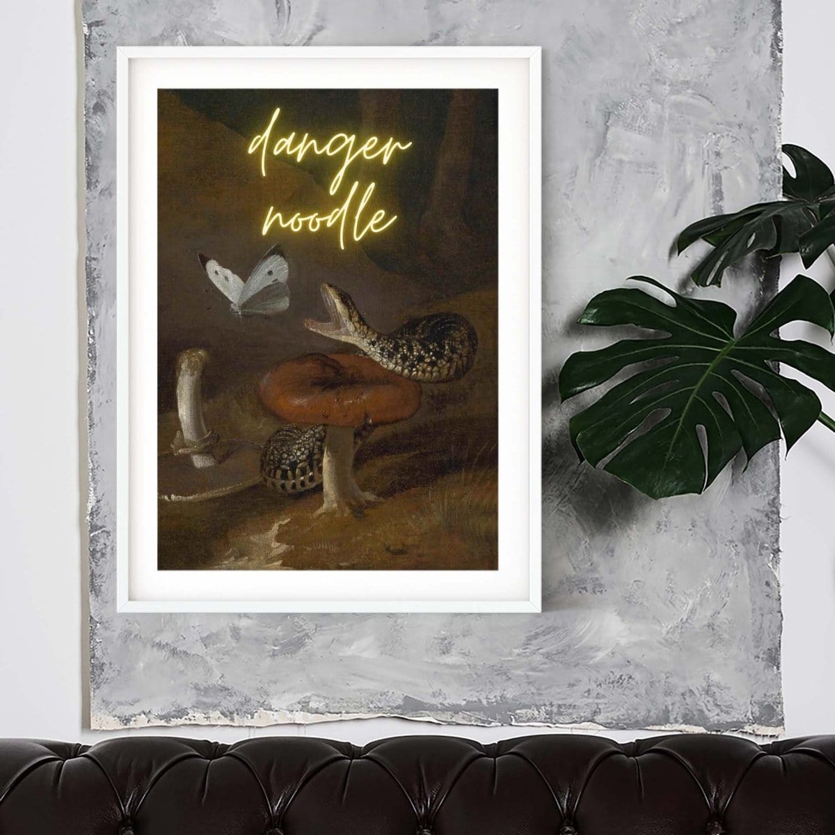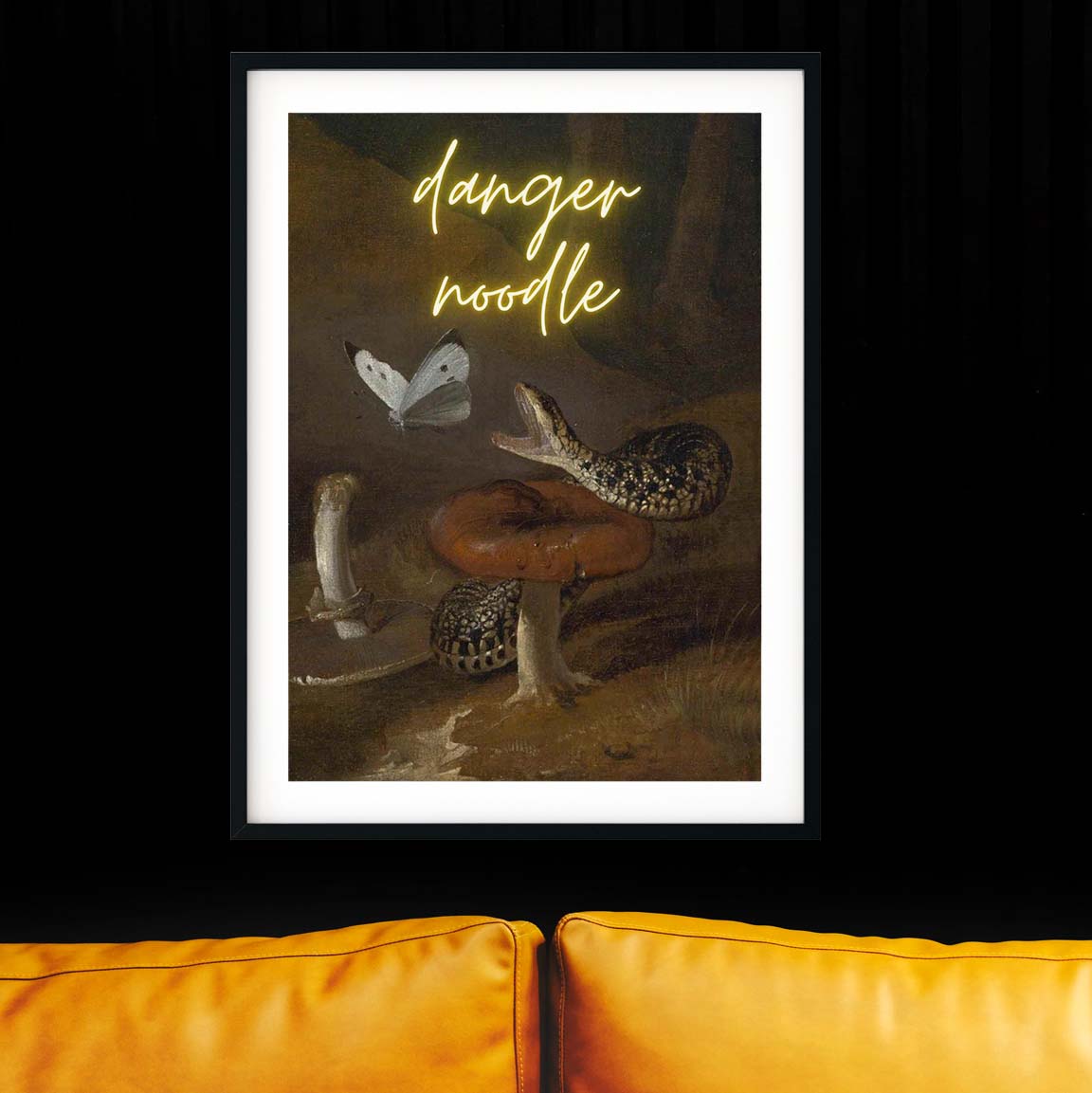 Modern yellow neon art Danger Noodle neon sign style typography over a vintage oil painting, funny funky snake print.