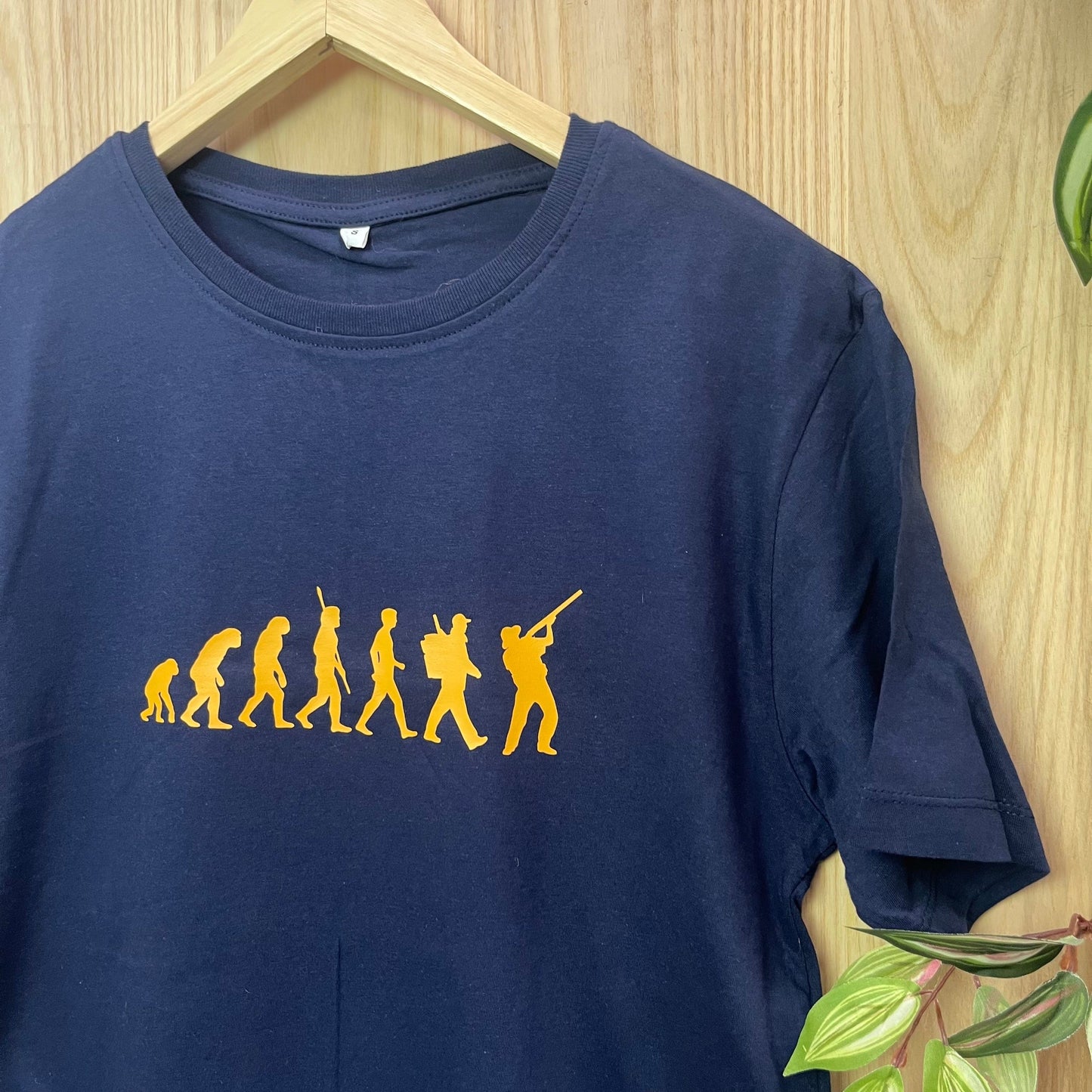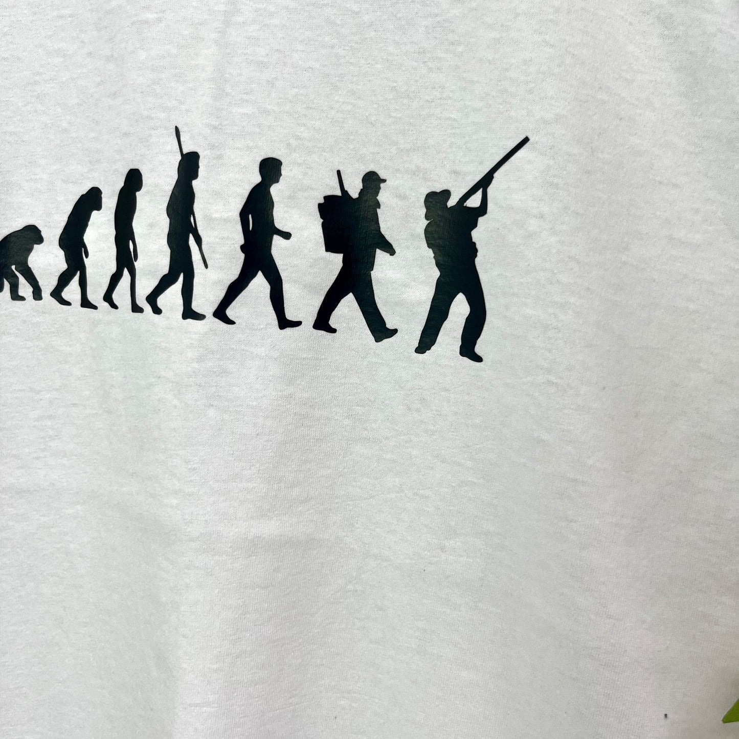 This tee features the minimalist design of Darwin’s Evolution, evolving into a man shooting on a hunt.