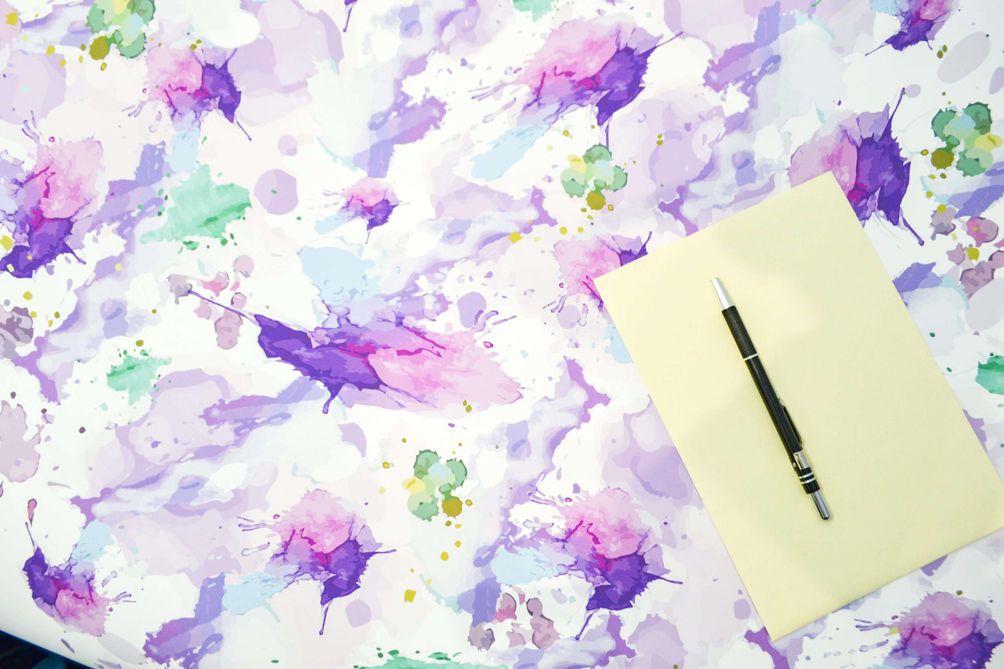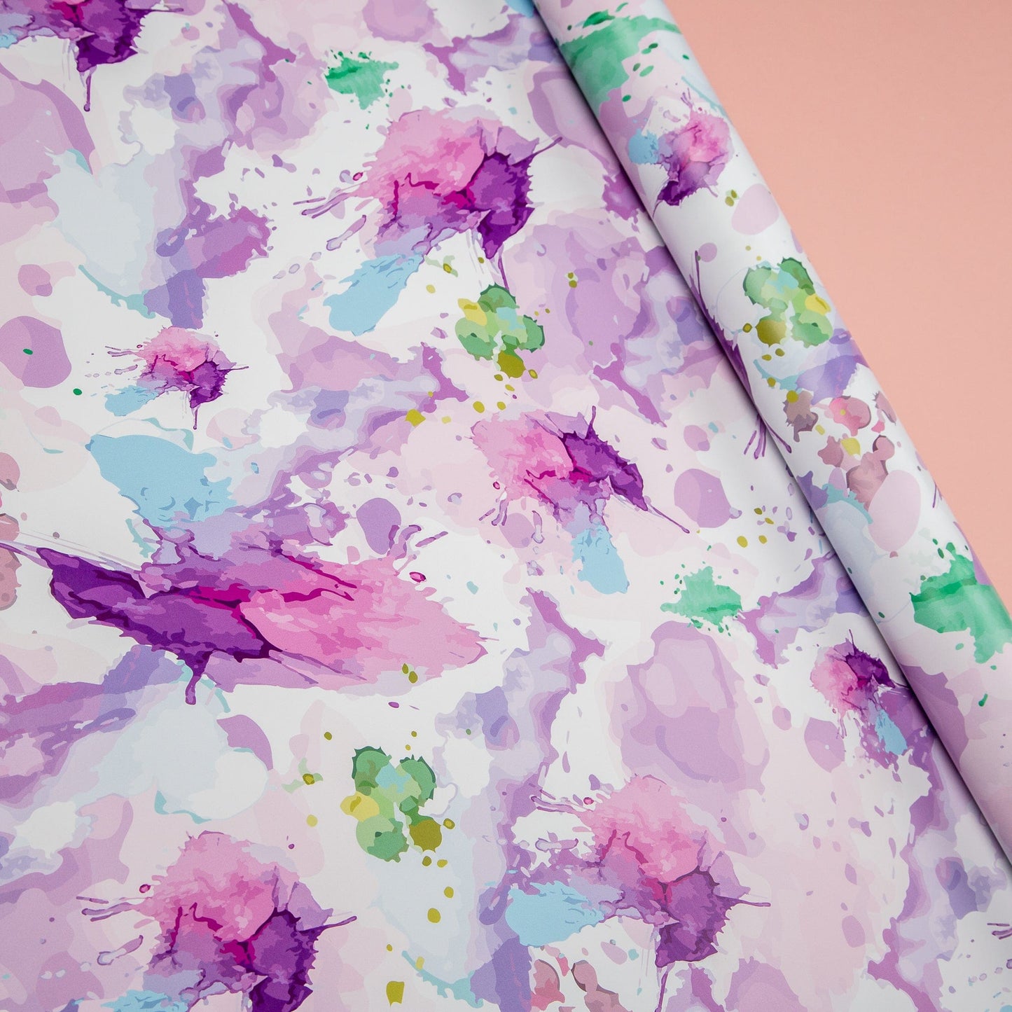 Bright watercolour splashes in blue, purple and green which have been digitised for a brighter quirky print for a fun, chic and cute wrapping paper.