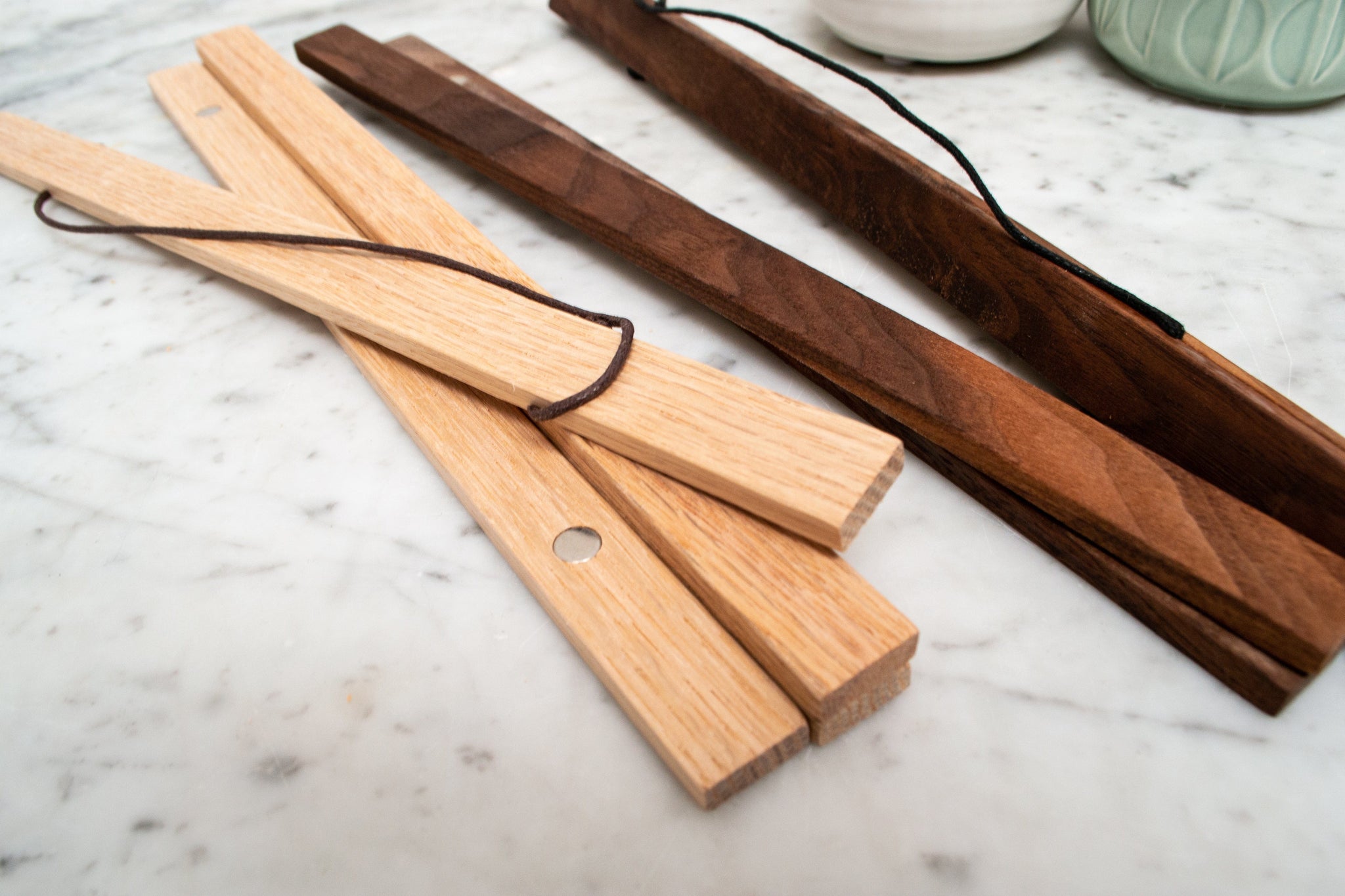 Our handmade picture hangers are an art lover's dream come true. It consists of two solid walnut wooden bars fitted with powerful magnets. All you have to do is sandwich your art between these bars, and voila! The magnets top and bottom grip your artwork securely, making handing poster prints a breeze.