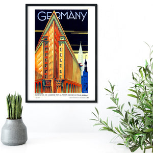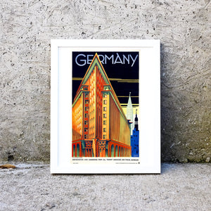 Vintage travel decor print. Germany wall art illustration print which has been taken from the original art deco poster and restored for a fresh retro travel print.