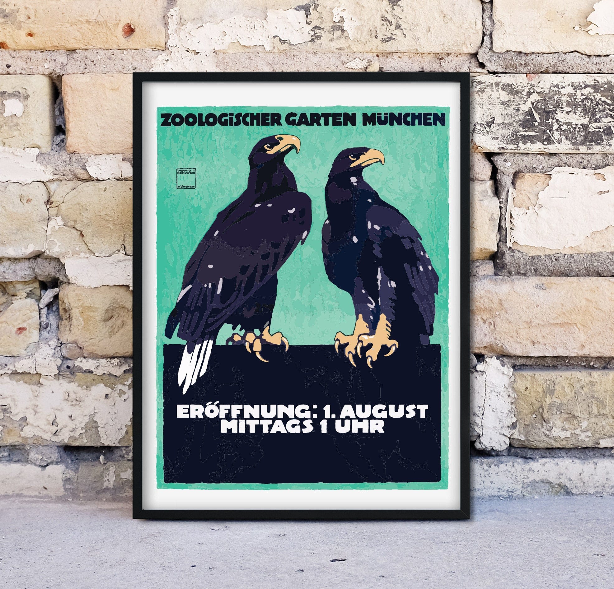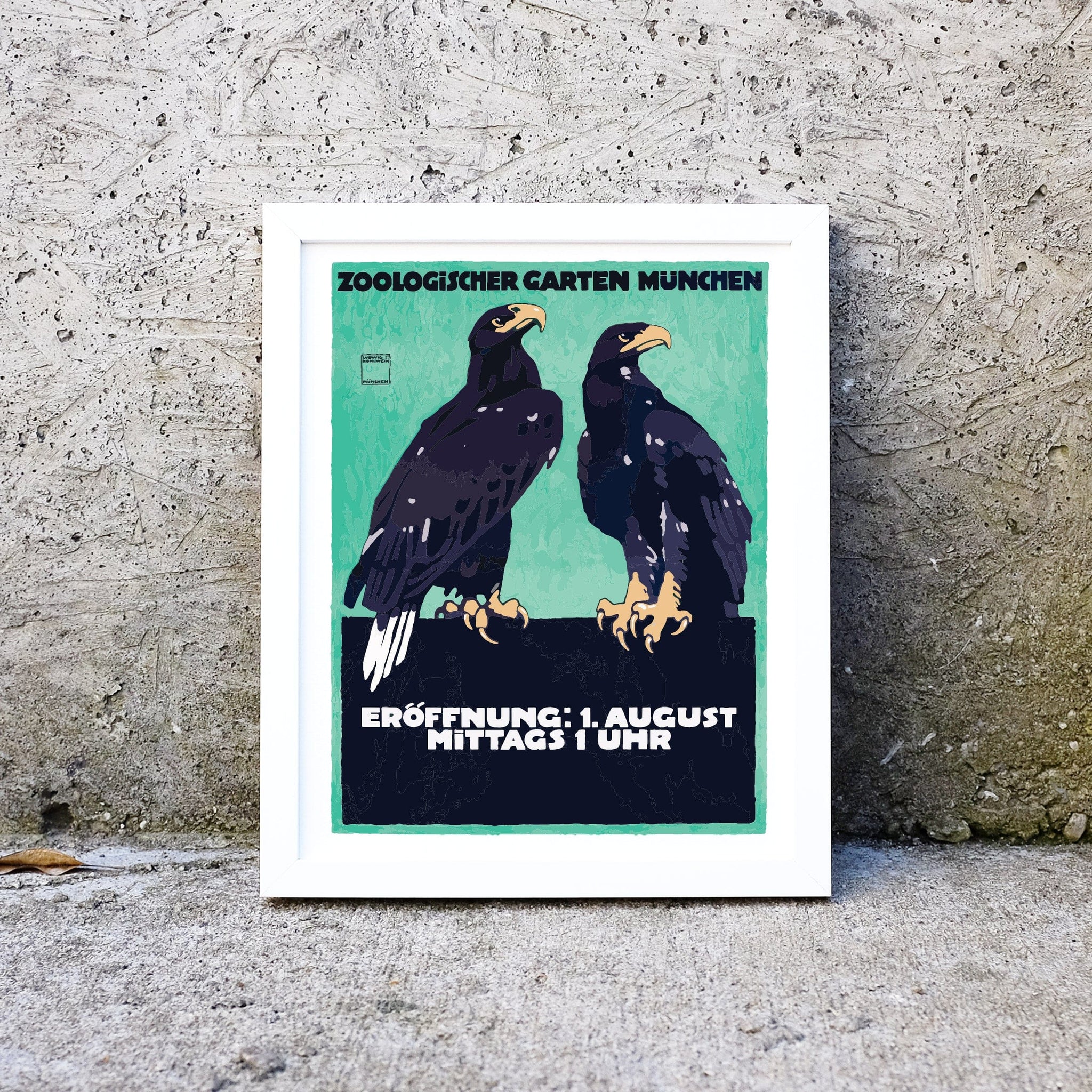 Vintage zoo illustration print. 1919 'Zooligischer Garten Munchen' animal print which has been digitally restored from a damaged original for a fresh retro print. The original ad was illustrated in 1919 by Ludwig Hohlwein featuring 2 eagles on a textured print background.