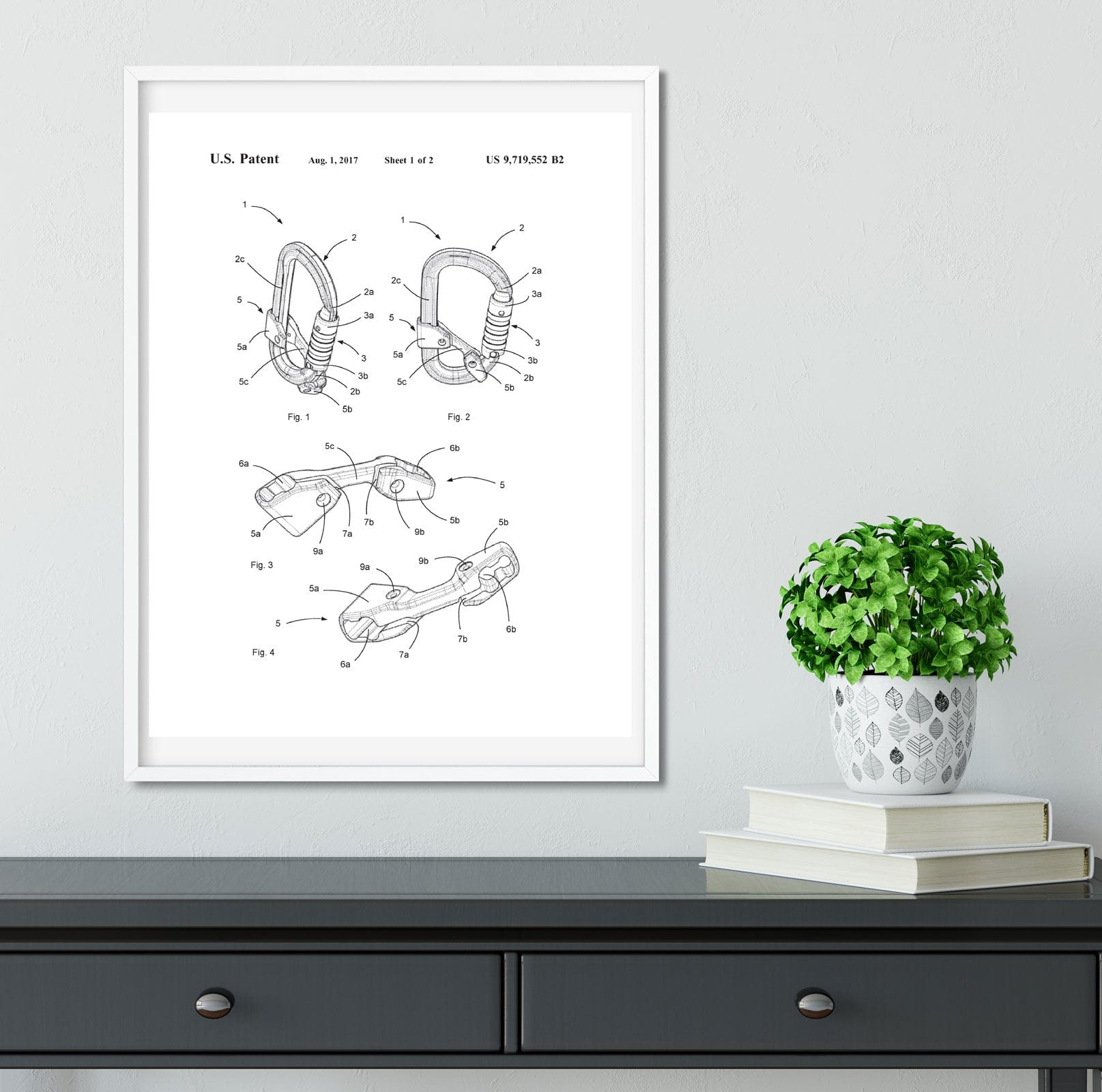 Framed climbing carabiner print patent art from the Original 2017 US Patent drawing for a carabiner, sports print.