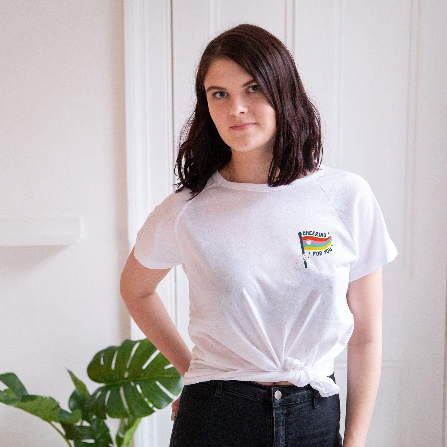 This minimalist t shirt is available in small to extra large and is unisex so has a more relaxed fit. The white t shirt is slightly see-through so tattoos may be visible.