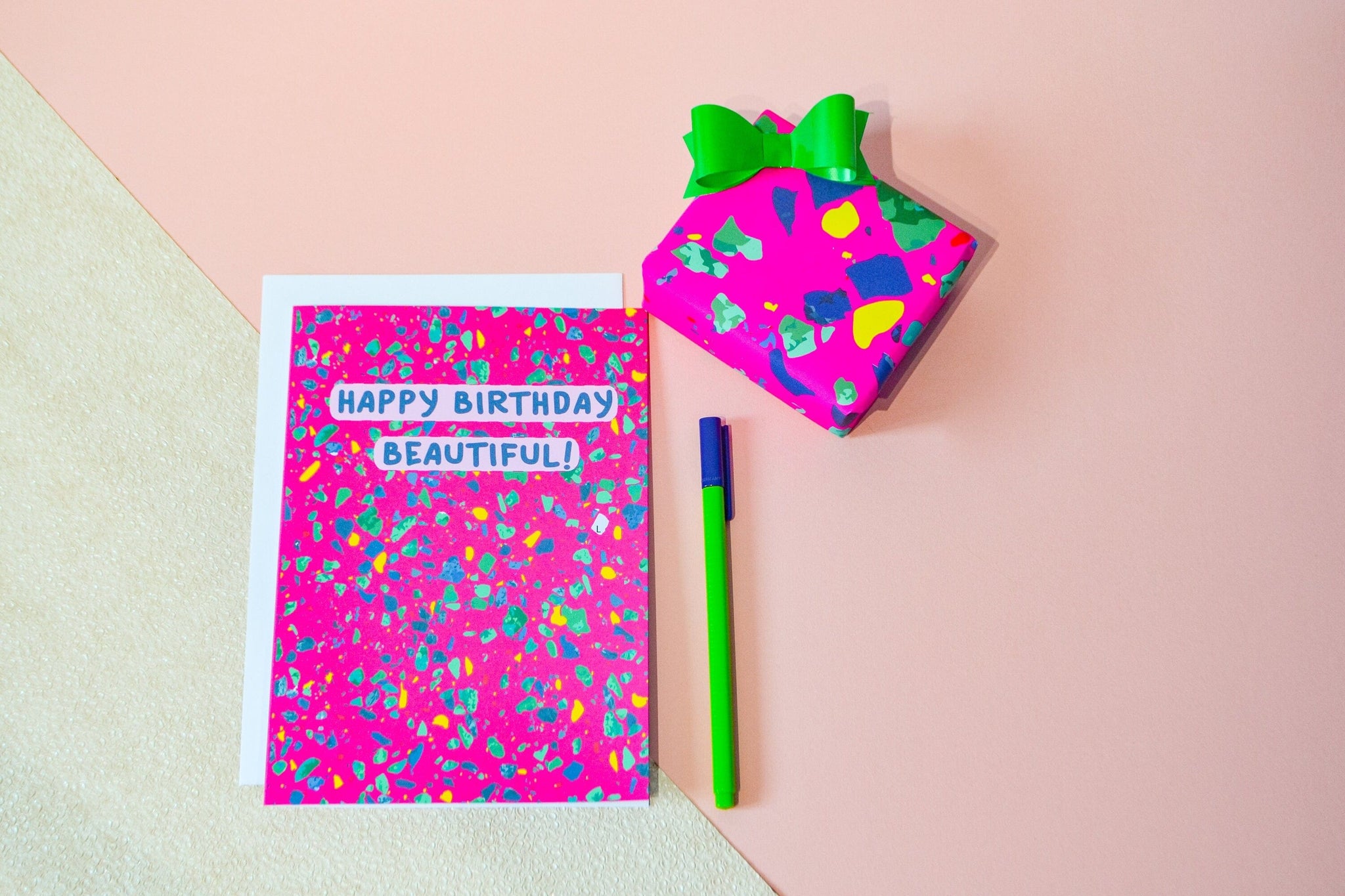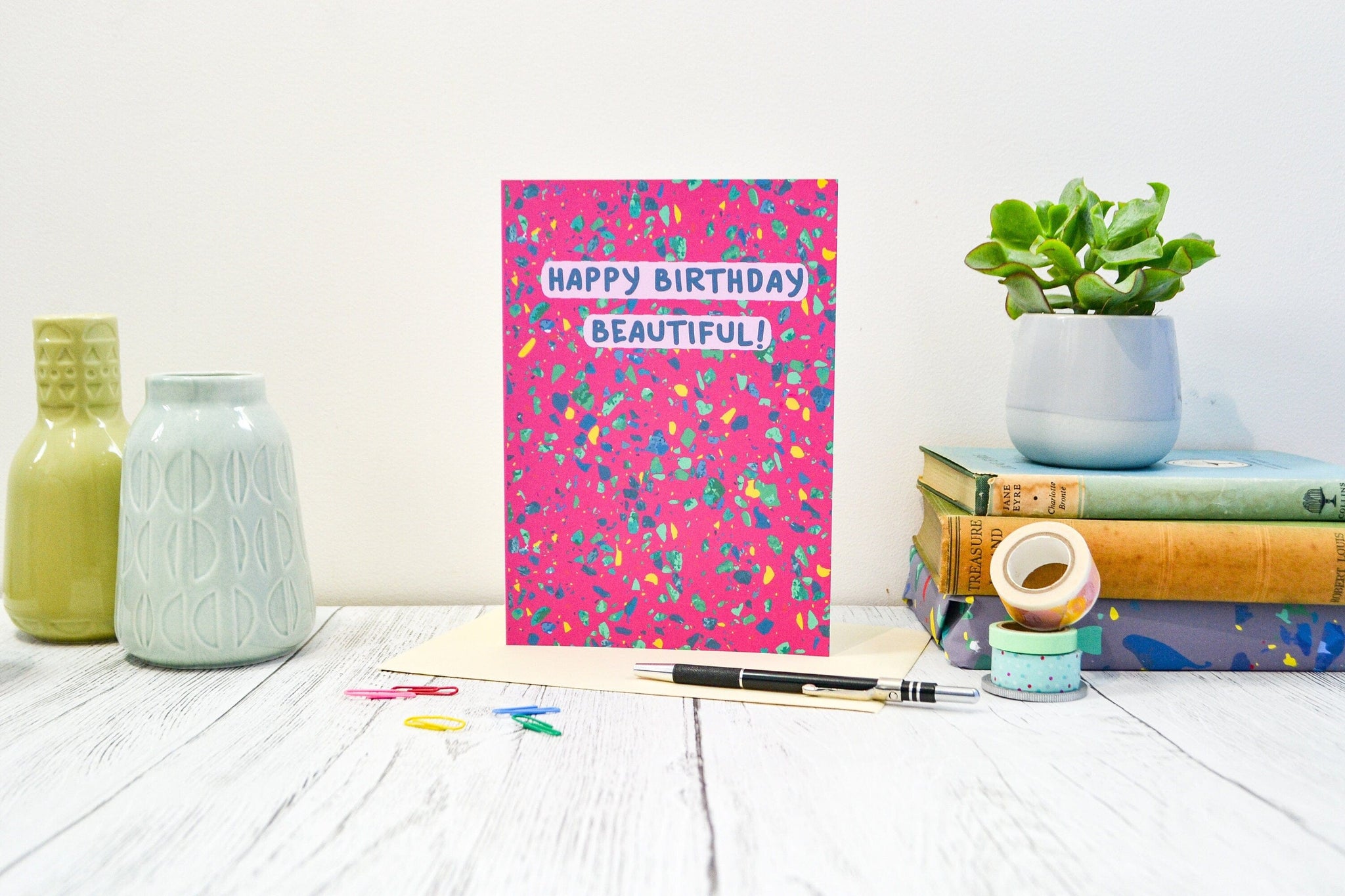 Large 'Happy Birthday Beautiful' pink Terazzo print funny birthday card for her. Gorgeous birthday female birthday card or girlfiend card ,or card for the most fabulous gay birthday