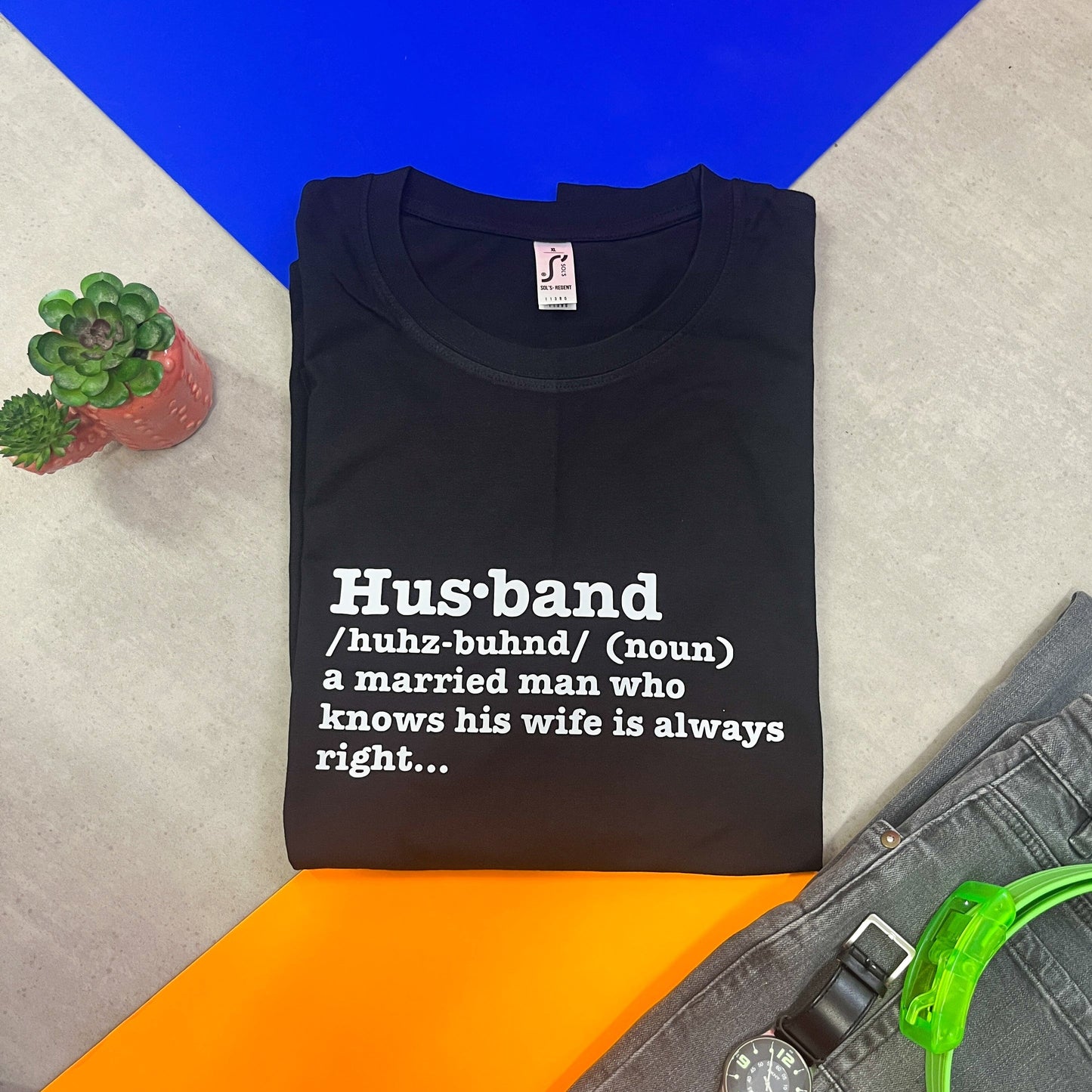 This hubby t shirt has the alternative meaning of husband hand pressed on to it. It states that a husband is "a married man who knows his wife is always right..."