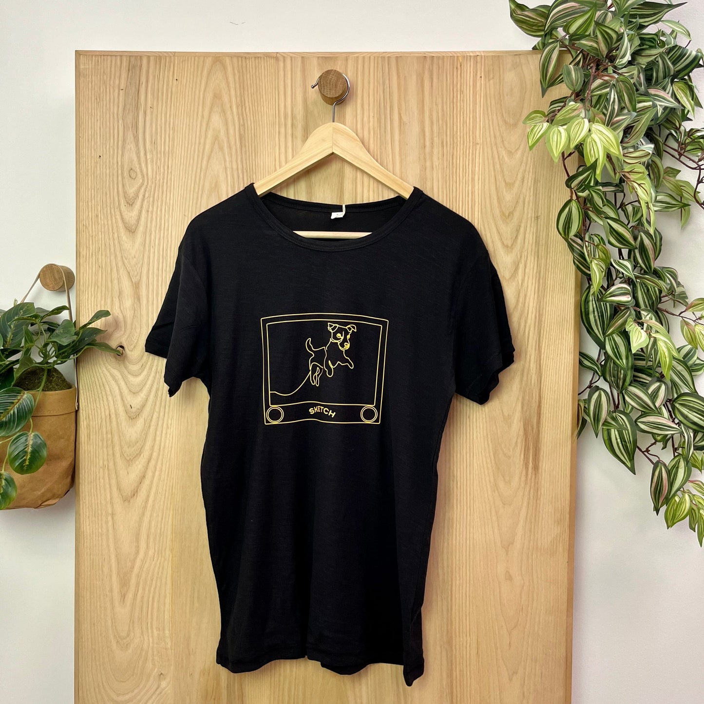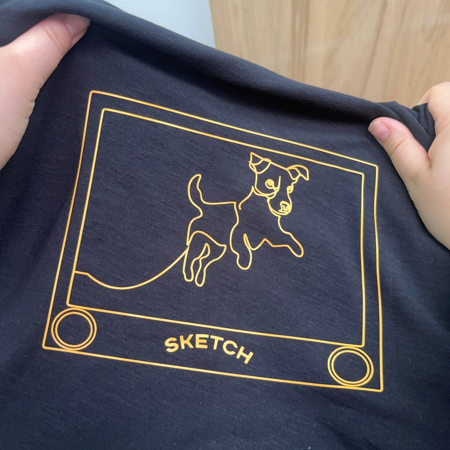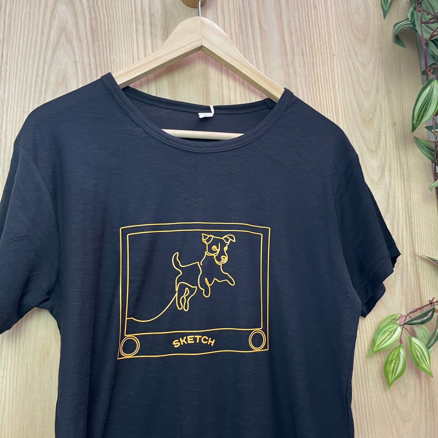 This tee features a line drawing of a Jack Russell dog made on the ever popular sketch toy .