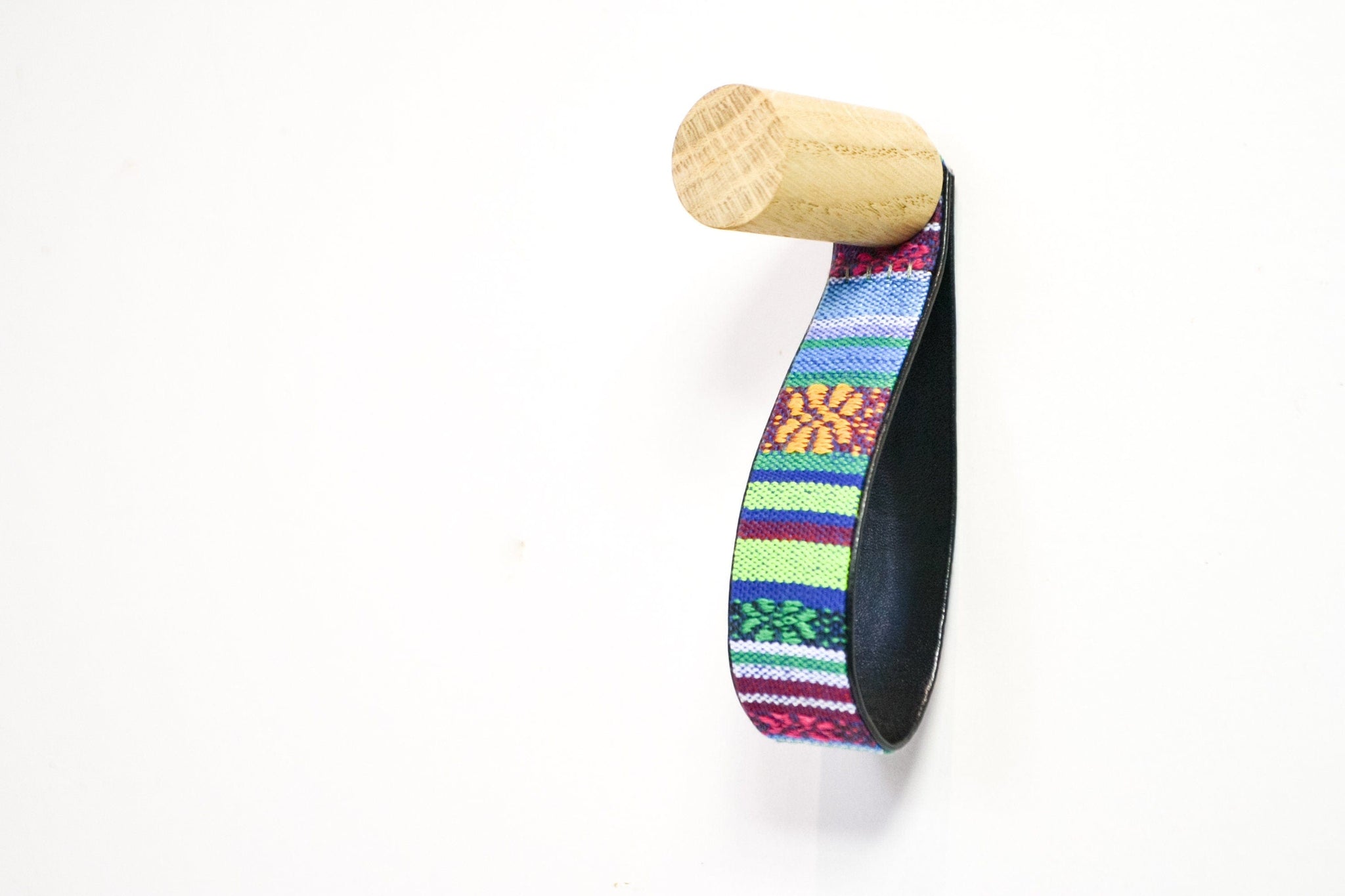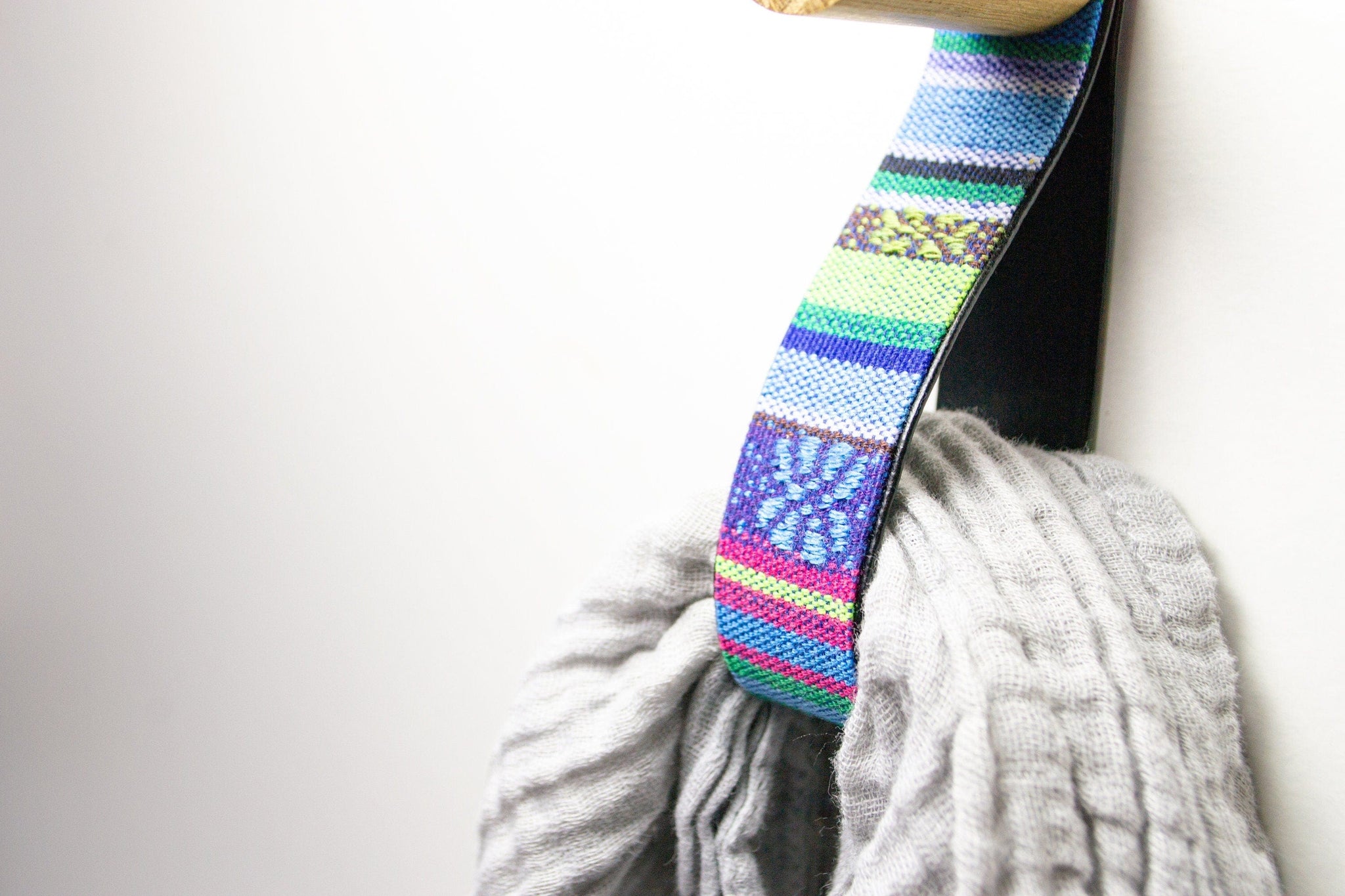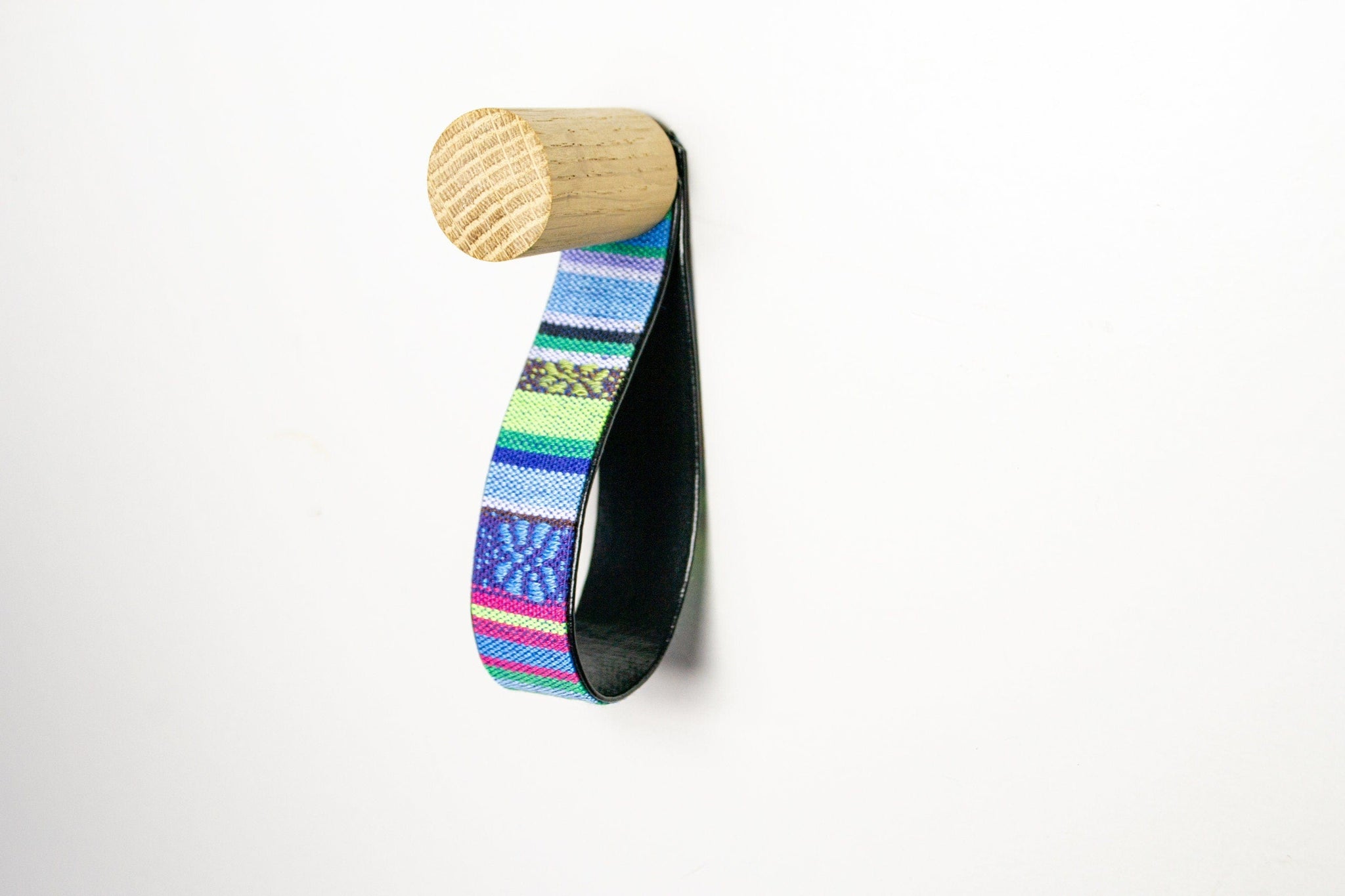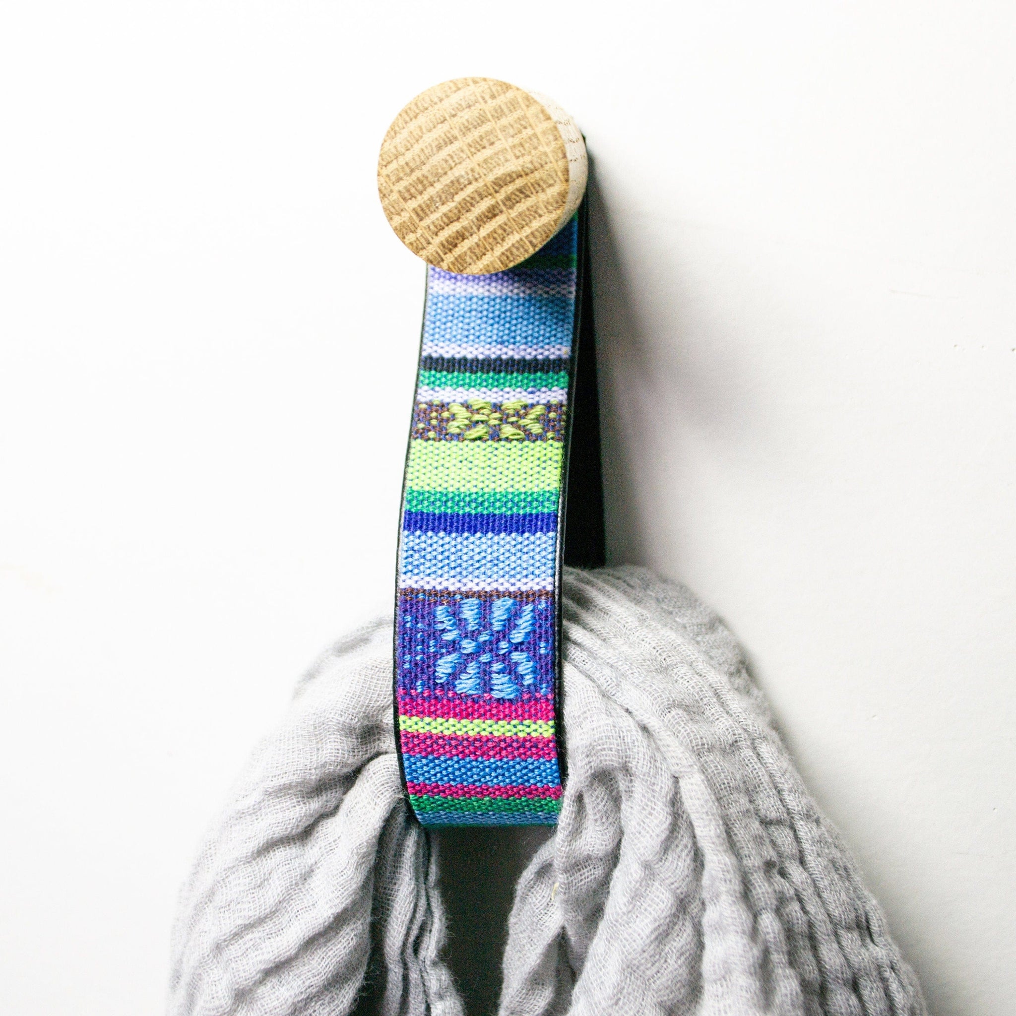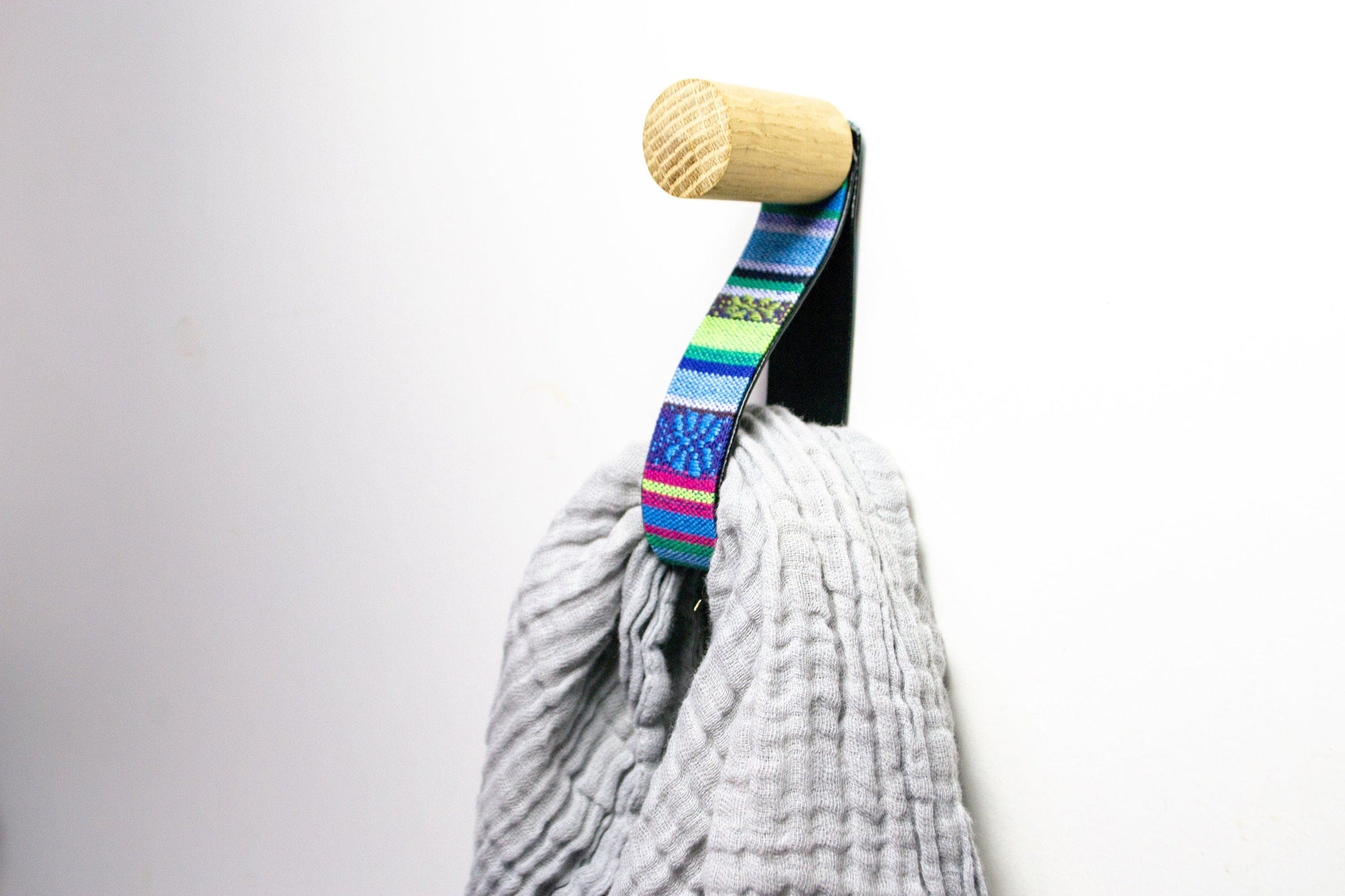 Oak Wood loop Wall Hook with faux leather strap, Colorful cotton towel loop, modern coat hook, woven strap towel hook wall storage loop