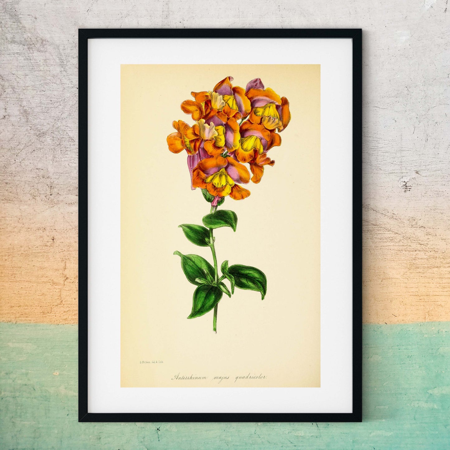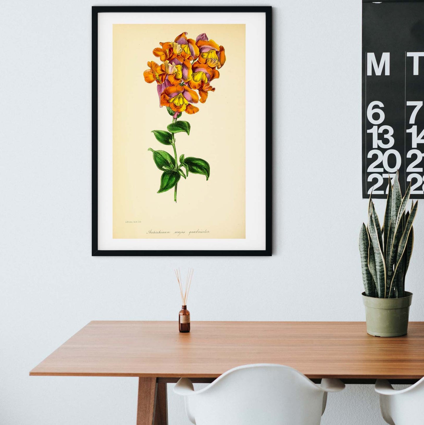 Framed Botanical prints: Orange, Pink and yellow snapdragon flower poster