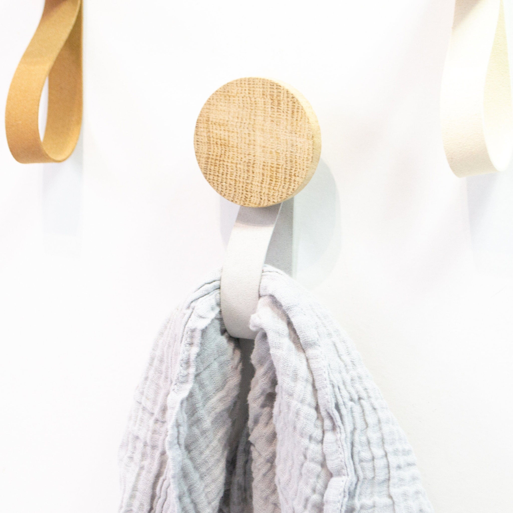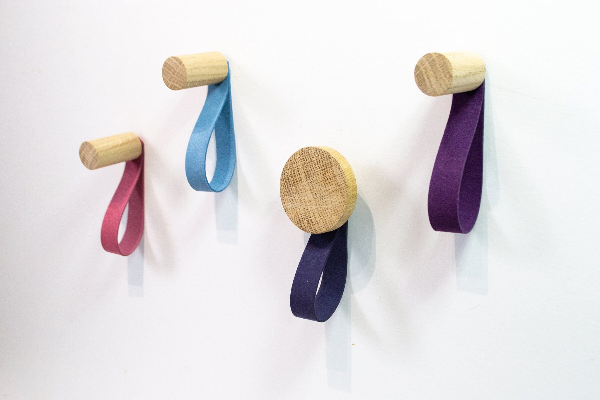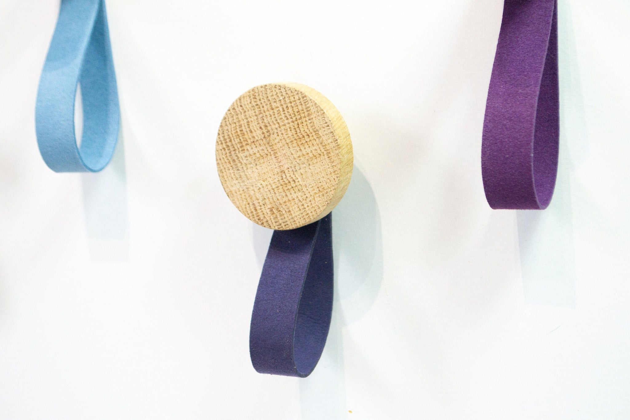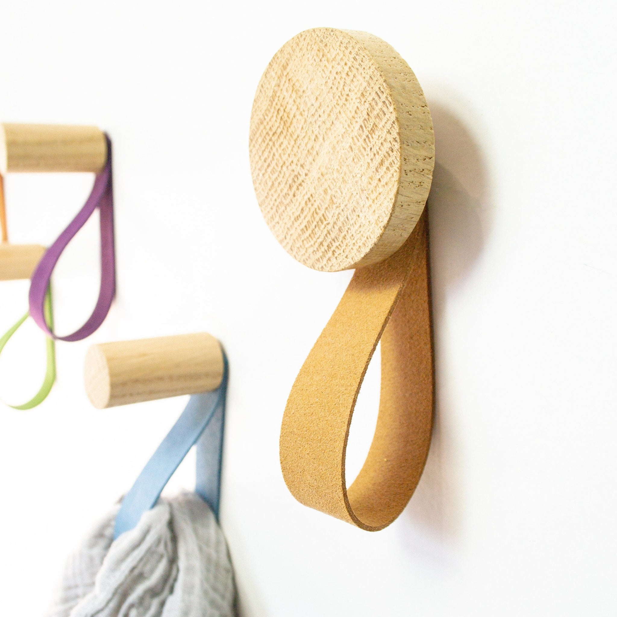 Round Oak Wood Wall Hook with vegan leather strap, Colorful faux leather loop wall hook coat hook, Towel hanger, towel hook wall storage