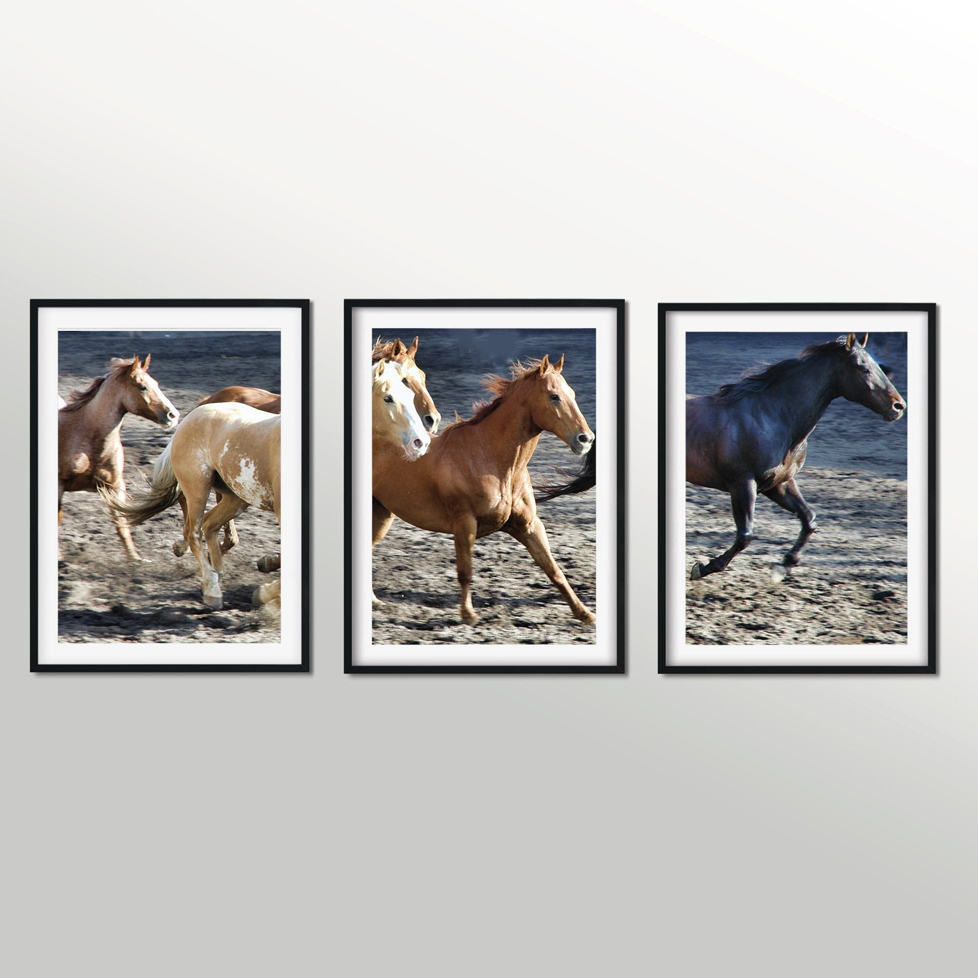 Wild horse photography print set, of horses galloping nature photography set across 3 frames to create a horse wall art print set.
