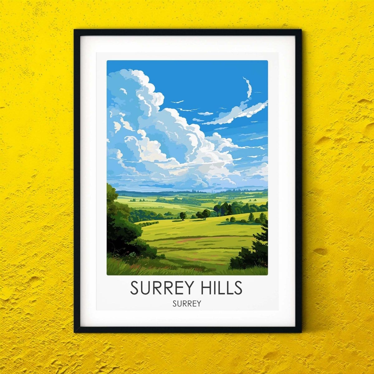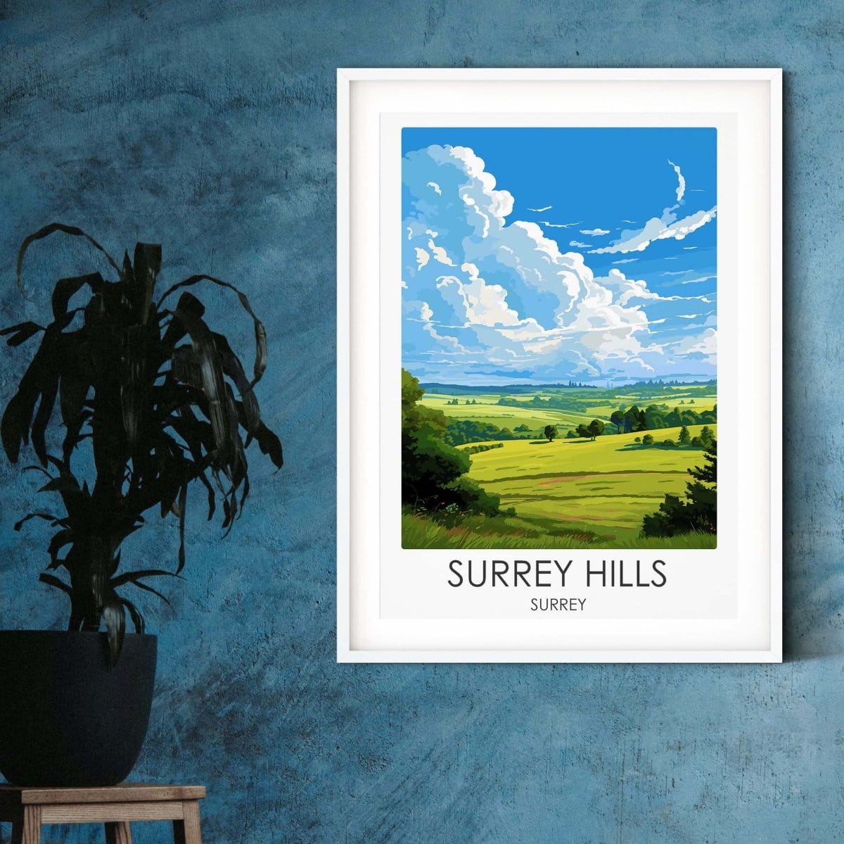 Vintage inspired travel posters UK destination print. Landscape print for Surrey Hills