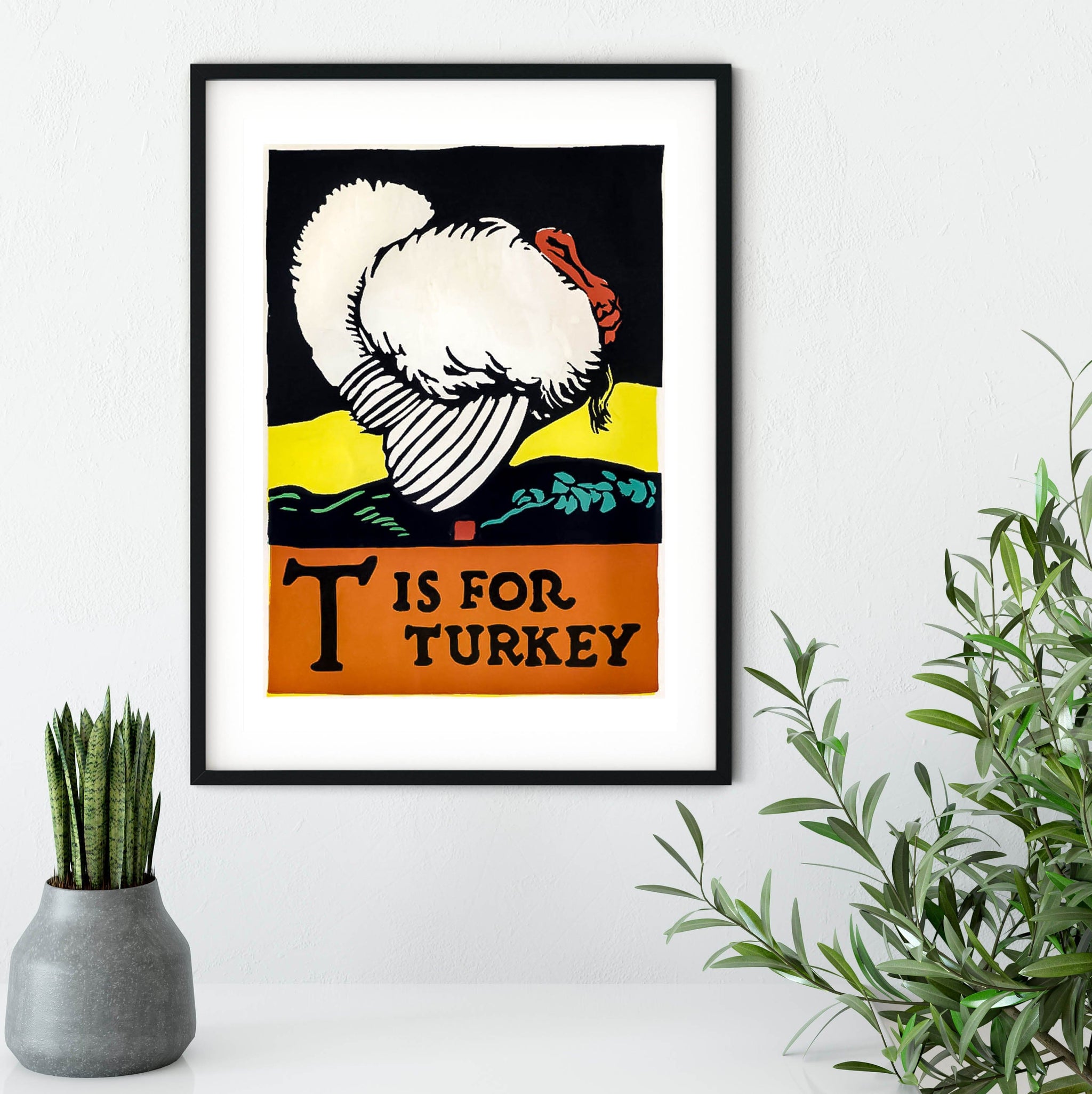 Alphabet Letter T is for Turkey print, from a 1923 USA children's vintage animal alphabet book-originally from a woodcut. Ideal bird wall art children's prints for bedroom.