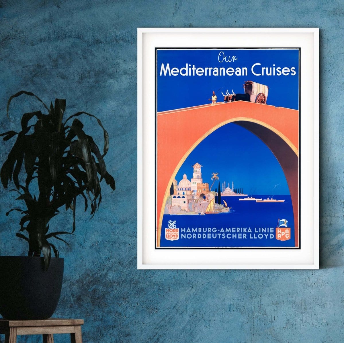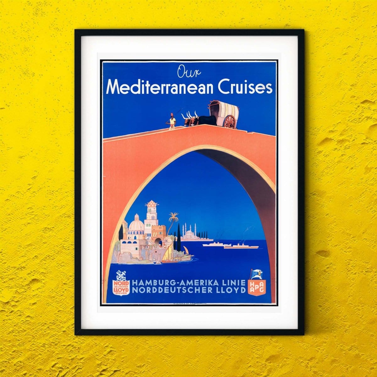 Vintage advert Mediterranean Cruises travel print. 1915 art deco advertising print which has been digitally restored for a fresh retro print.