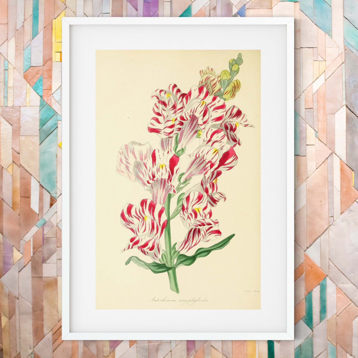 Antique Botanical information: Antirrhinum majus var. caryophylloides, or pink striped snap dragon. Pink Flower art, from New Zealand chromolithograph prints of flowers. Illustration for Paxton's Flower Garden by Professor Lindley and Sir Joseph Paxton revised by Thomas Baines (Cassell, 1882)More from this series of vintage botanical prints