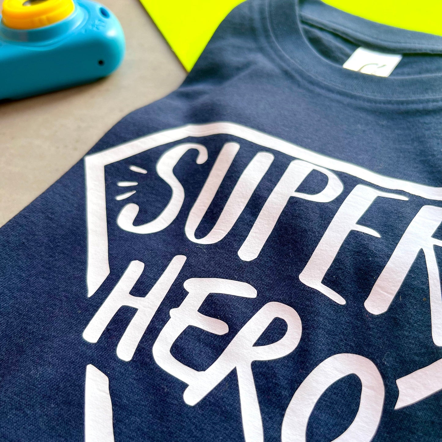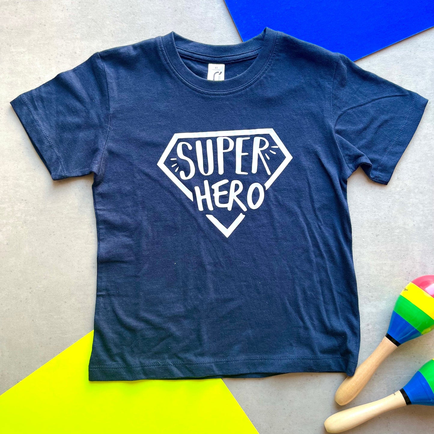 This superhero t shirt reads "Super Hero"  in white vinyl which is hand pressed onto an ethically sourced t shirt. Glitter and metallic blue vinyl versions also available